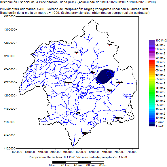 It contains the spatial distribution of the rainfalls registered by the pluviometers SAIH in the hydrological day selected (of 08:00 to 08:00 of the following day). Also it shows a map of the basin with the location of the pluviometers SAIH and the value of his rainfall accumulated in the hydrological day. Finally presents a table with the list of the rainfall in every pluviometer SAIH distributed per hours in the hydrological selected day.