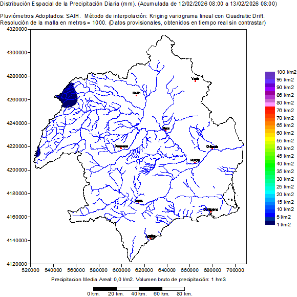 Contiene la distribución espacial de las precipitaciones registradas por los pluviómetros SAIH en el día hidrológico seleccionado (de 08:00 a 08:00 del día siguiente). También muestra un mapa de la cuenca con la ubicación de los pluviómetros SAIH y el valor de su precipitación acumulada en el día hidrológico. Por último presenta una tabla con el listado de la precipitación en cada pluviómetro SAIH distribuida por horas en el día hidrológico seleccionado