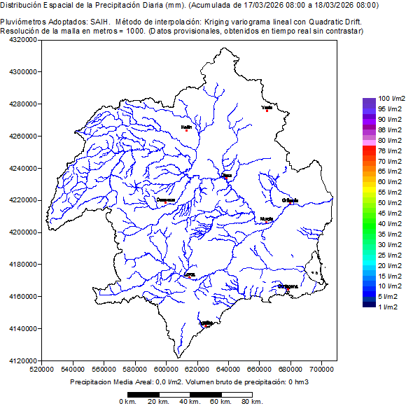 Contiene la distribución espacial de las precipitaciones registradas por los pluviómetros SAIH en el día hidrológico seleccionado (de 08:00 a 08:00 del día siguiente). También muestra un mapa de la cuenca con la ubicación de los pluviómetros SAIH y el valor de su precipitación acumulada en el día hidrológico. Por último presenta una tabla con el listado de la precipitación en cada pluviómetro SAIH distribuida por horas en el día hidrológico seleccionado