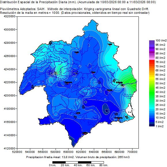 Contiene la distribución espacial de las precipitaciones registradas por los pluviómetros SAIH en el día hidrológico seleccionado (de 08:00 a 08:00 del día siguiente). También muestra un mapa de la cuenca con la ubicación de los pluviómetros SAIH y el valor de su precipitación acumulada en el día hidrológico. Por último presenta una tabla con el listado de la precipitación en cada pluviómetro SAIH distribuida por horas en el día hidrológico seleccionado