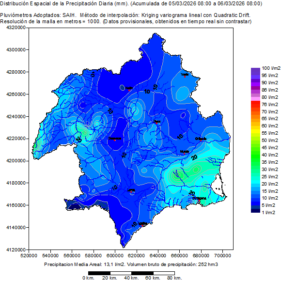 Contiene la distribución espacial de las precipitaciones registradas por los pluviómetros SAIH en el día hidrológico seleccionado (de 08:00 a 08:00 del día siguiente). También muestra un mapa de la cuenca con la ubicación de los pluviómetros SAIH y el valor de su precipitación acumulada en el día hidrológico. Por último presenta una tabla con el listado de la precipitación en cada pluviómetro SAIH distribuida por horas en el día hidrológico seleccionado