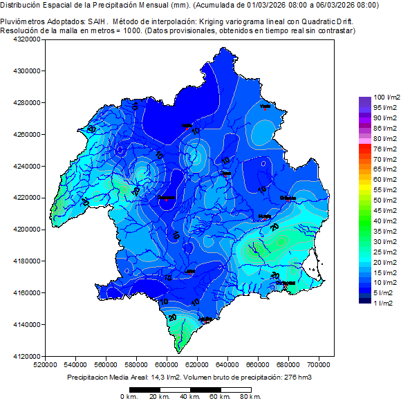 Contiene la distribución espacial de las precipitaciones registradas por los pluviómetros SAIH en el mes seleccionado. También muestra un mapa de la cuenca con la ubicación de los pluviómetros SAIH y el valor de su precipitación acumulada en el mes. Por último presenta una tabla con el listado de la precipitación en cada pluviómetro SAIH distribuida por días en el mes.