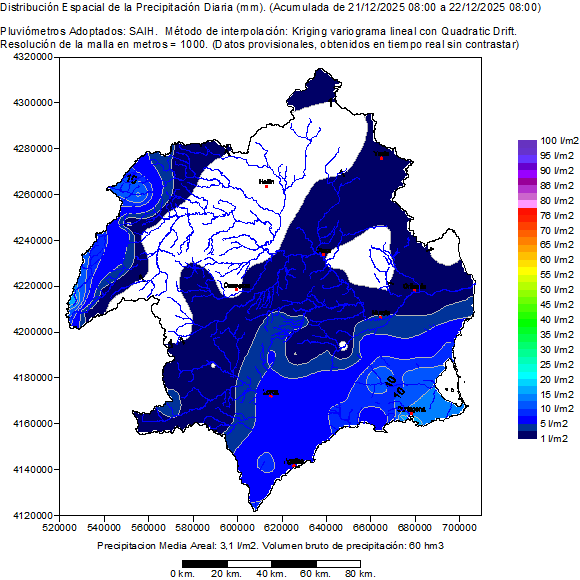 Conté la distribució espacial de les precipitacions registrades pels pluviómetros/ SAIH en el dia hidrològic seleccionat (de 08:00 a 08:00 de l'endemà). També mostra un mapa de la conca amb la ubicació dels pluviómetros SAIH i el valor de la seua precipitació acumulada en el dia hidrològic. Finalment presenta una taula amb el llistat de la precipitació en cada pluviómetro SAIH distribuïda per hores en el dia hidrològic seleccionat.