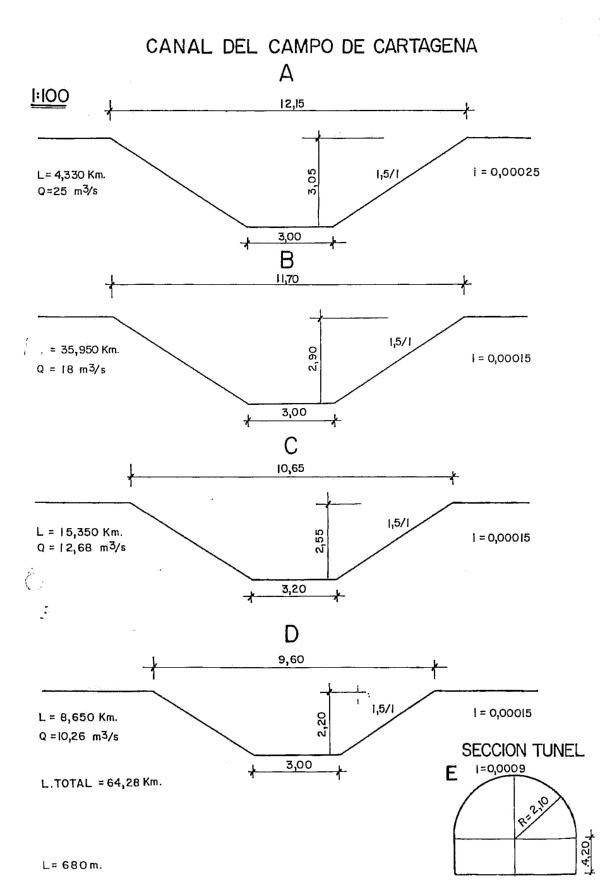The source of the Cartagena Canal is La Pedrera reservoir, at a height of 75.00, ending at La Guía road, near Cartagena, and it has a total length of 64.28 km.