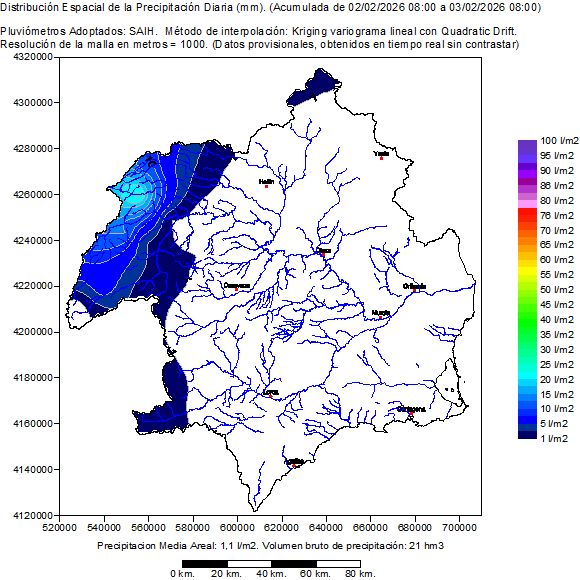 It contains the spatial distribution of the rainfalls registered by the pluviometers SAIH in the hydrological day selected (of 08:00 to 08:00 of the following day). Also it shows a map of the basin with the location of the pluviometers SAIH and the value of his rainfall accumulated in the hydrological day. Finally presents a table with the list of the rainfall in every pluviometer SAIH distributed per hours in the hydrological selected day.