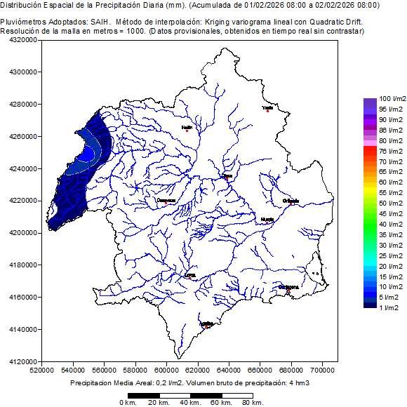 It contains the spatial distribution of the rainfalls registered by the pluviometers SAIH in the hydrological day selected (of 08:00 to 08:00 of the following day). Also it shows a map of the basin with the location of the pluviometers SAIH and the value of his rainfall accumulated in the hydrological day. Finally presents a table with the list of the rainfall in every pluviometer SAIH distributed per hours in the hydrological selected day.