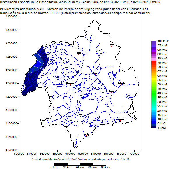 It contains the spatial distribution of the rainfalls registered by the pluviometers SAIH in the selected month. Also it shows a map of the basin with the location of the pluviometers SAIH and the value of his rainfall accumulated in the month. Finally presents a table with the list of the rainfall in every pluviometer SAIH distributed per days in the month.
