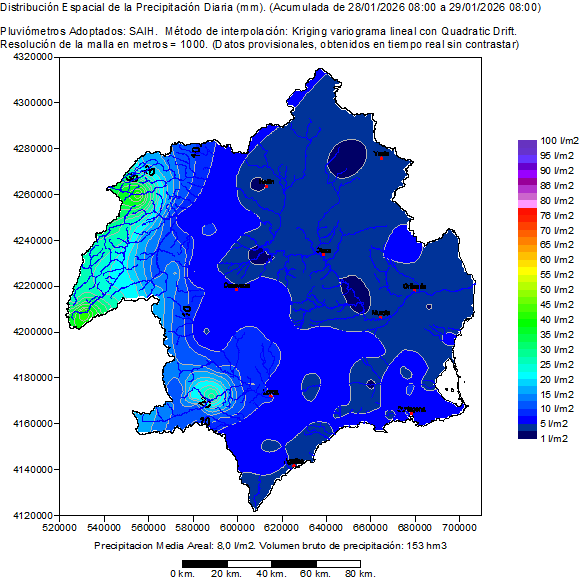 It contains the spatial distribution of the rainfalls registered by the pluviometers SAIH in the hydrological day selected (of 08:00 to 08:00 of the following day). Also it shows a map of the basin with the location of the pluviometers SAIH and the value of his rainfall accumulated in the hydrological day. Finally presents a table with the list of the rainfall in every pluviometer SAIH distributed per hours in the hydrological selected day.