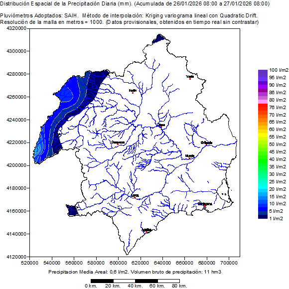 It contains the spatial distribution of the rainfalls registered by the pluviometers SAIH in the hydrological day selected (of 08:00 to 08:00 of the following day). Also it shows a map of the basin with the location of the pluviometers SAIH and the value of his rainfall accumulated in the hydrological day. Finally presents a table with the list of the rainfall in every pluviometer SAIH distributed per hours in the hydrological selected day.