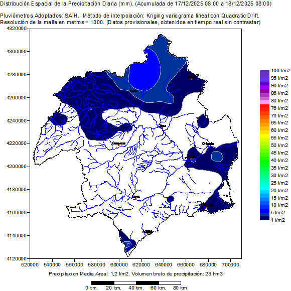 Contiene la distribución espacial de las precipitaciones registradas por los pluviómetros SAIH en el día hidrológico seleccionado (de 08:00 a 08:00 del día siguiente). También muestra un mapa de la cuenca con la ubicación de los pluviómetros SAIH y el valor de su precipitación acumulada en el día hidrológico. Por último presenta una tabla con el listado de la precipitación en cada pluviómetro SAIH distribuida por horas en el día hidrológico seleccionado
