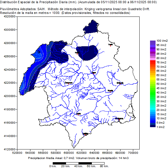 Conté la distribució espacial de les precipitacions registrades pels pluviómetros/ SAIH en el dia hidrològic seleccionat (de 08:00 a 08:00 de l'endemà). També mostra un mapa de la conca amb la ubicació dels pluviómetros SAIH i el valor de la seua precipitació acumulada en el dia hidrològic. Finalment presenta una taula amb el llistat de la precipitació en cada pluviómetro SAIH distribuïda per hores en el dia hidrològic seleccionat.