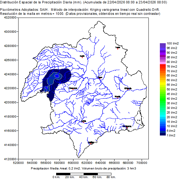 Conté la distribució espacial de les precipitacions registrades pels pluviómetros/ SAIH en el dia hidrològic seleccionat (de 08:00 a 08:00 de l'endemà). També mostra un mapa de la conca amb la ubicació dels pluviómetros SAIH i el valor de la seua precipitació acumulada en el dia hidrològic. Finalment presenta una taula amb el llistat de la precipitació en cada pluviómetro SAIH distribuïda per hores en el dia hidrològic seleccionat.
