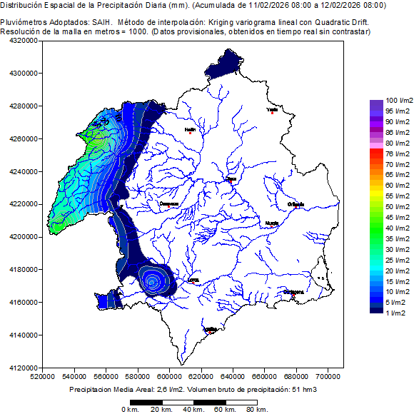Conté la distribució espacial de les precipitacions registrades pels pluviómetros/ SAIH en el dia hidrològic seleccionat (de 08:00 a 08:00 de l'endemà). També mostra un mapa de la conca amb la ubicació dels pluviómetros SAIH i el valor de la seua precipitació acumulada en el dia hidrològic. Finalment presenta una taula amb el llistat de la precipitació en cada pluviómetro SAIH distribuïda per hores en el dia hidrològic seleccionat.